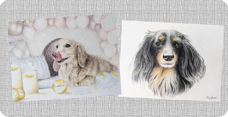 先生の絵の魅力は、ただ写真を写すのではなく、その犬の個性や愛らしさ、そして性格までも描き出してしまうところです。そんな先生の作品に惹かれてから数年、私も先生のご指導を受けながら、一生の趣味として、先生のような心温まる絵が描けるようにこれからも精進していきたいです。